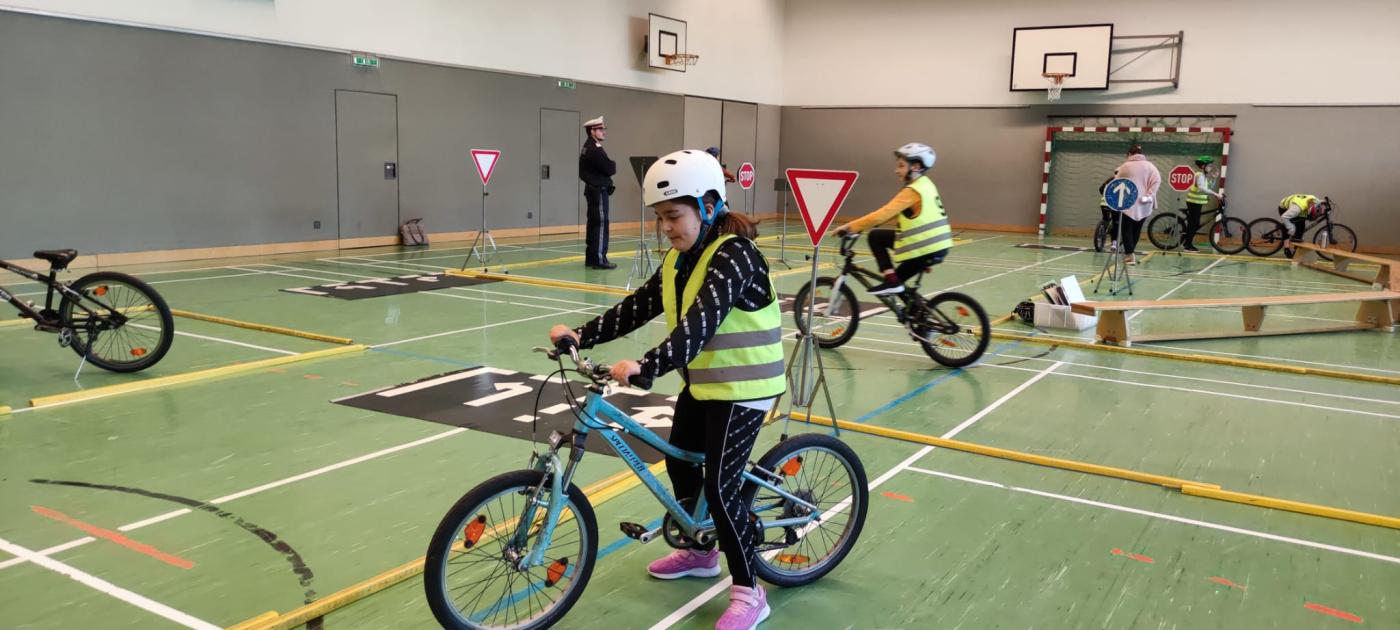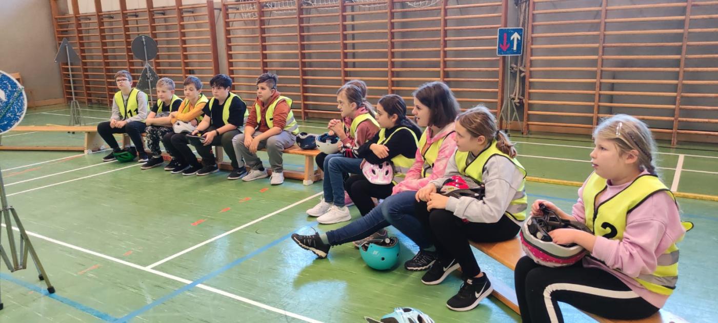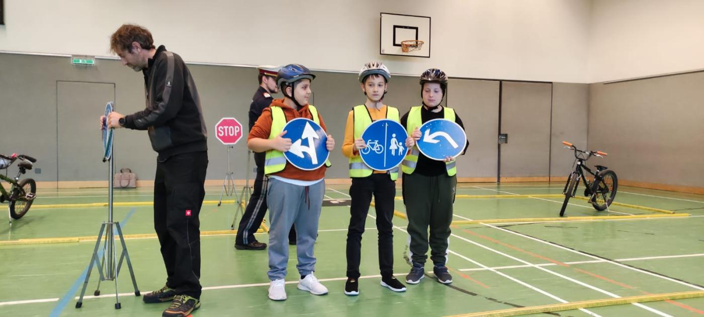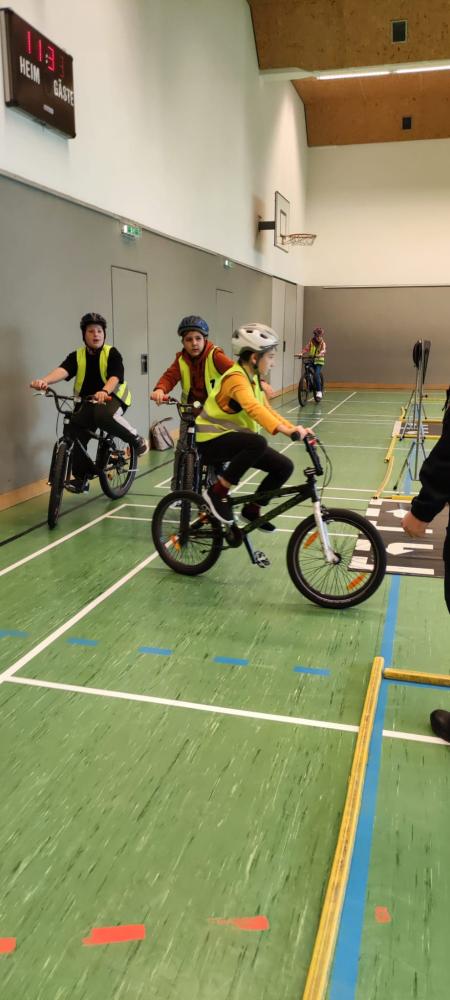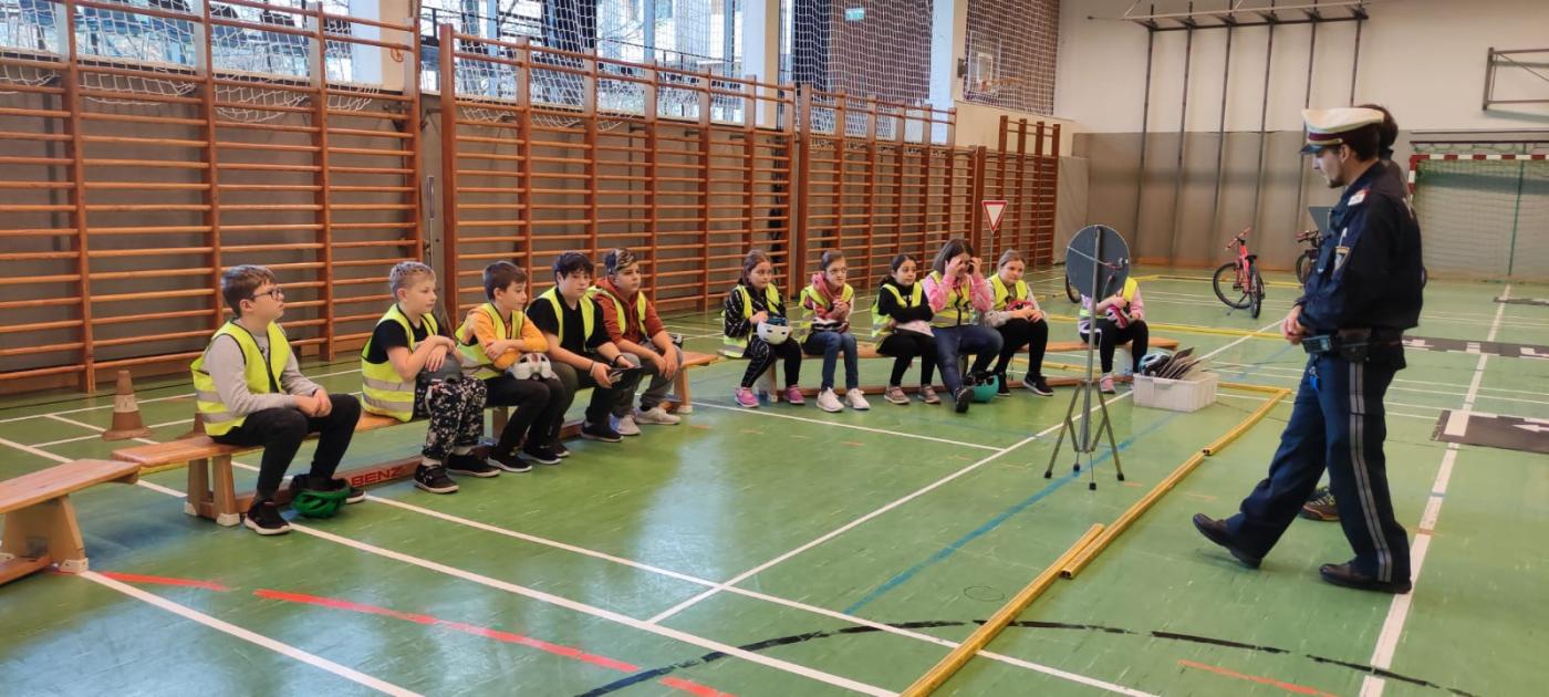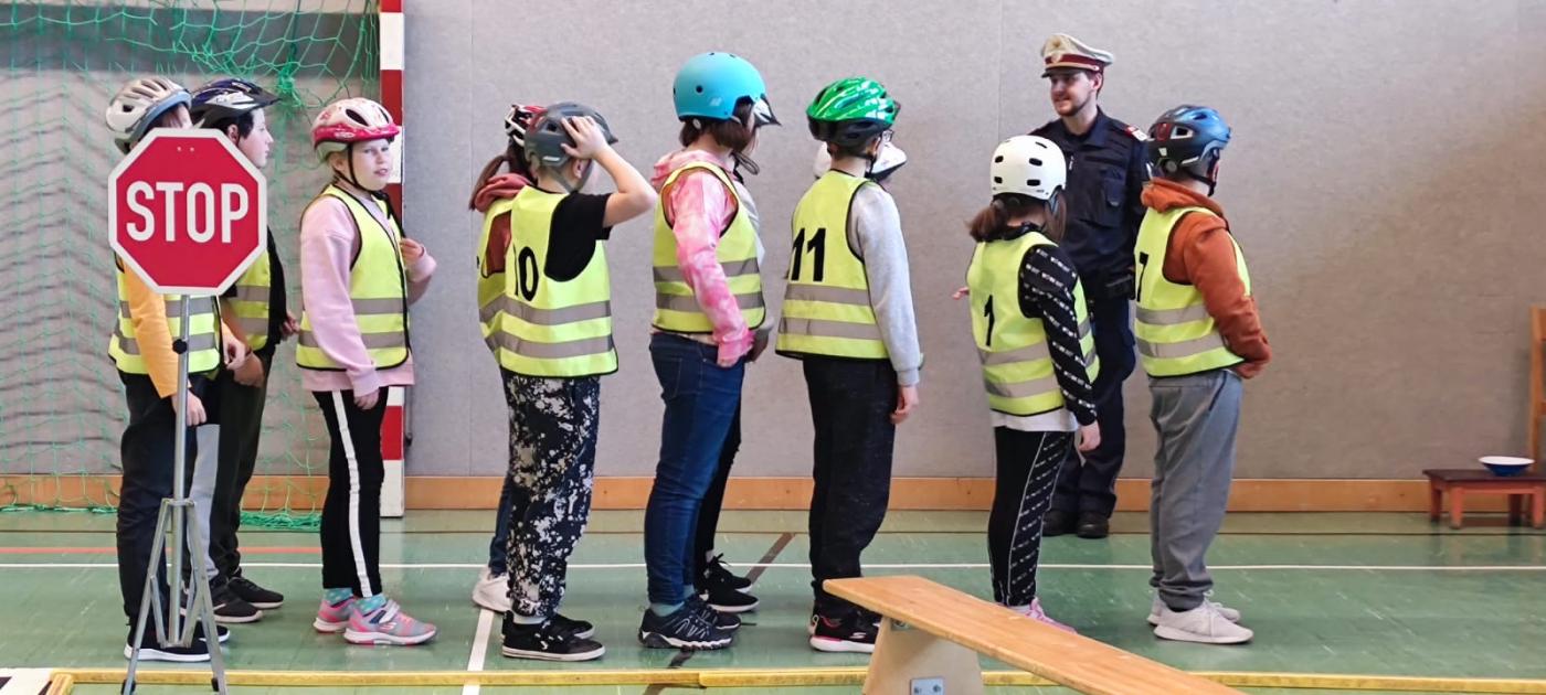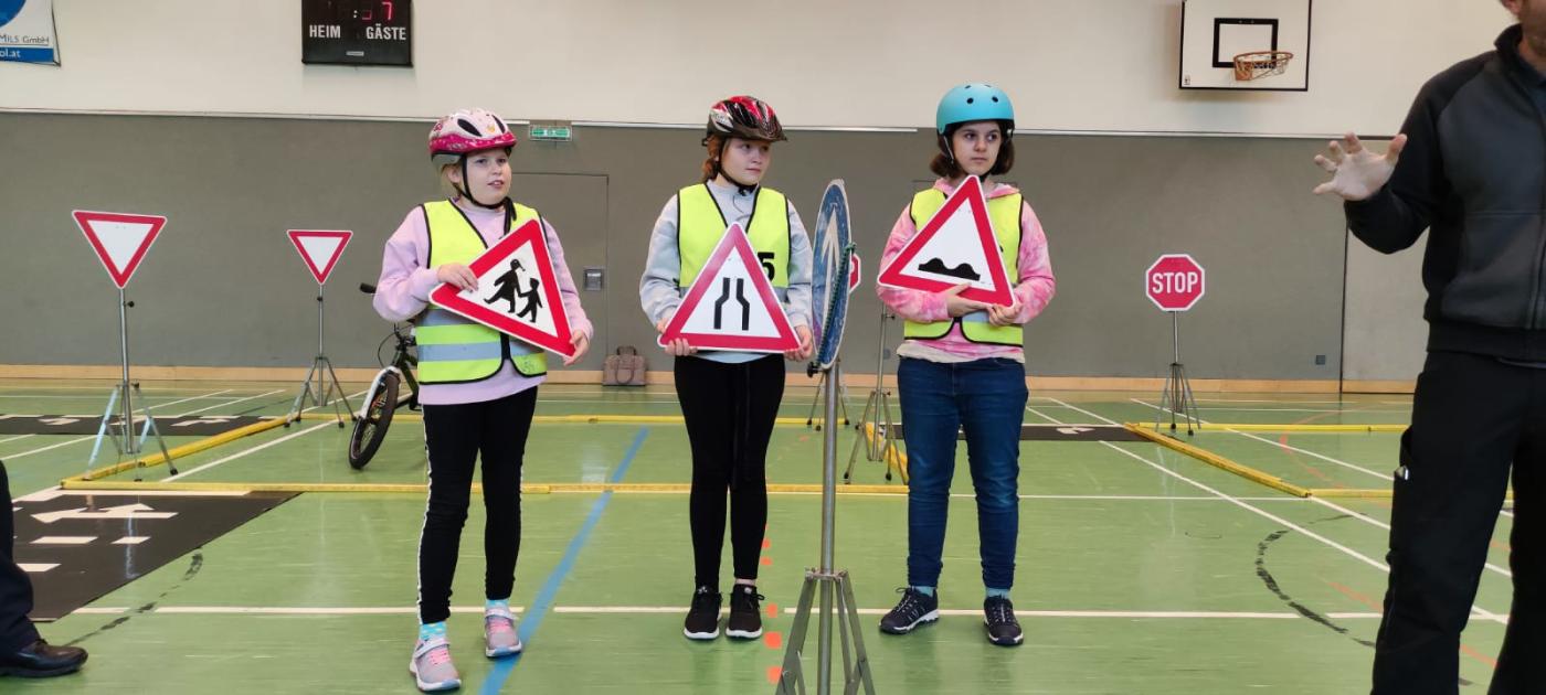 Michael und Inspektor Bernhard gaben zuerst eine theoretische Einführung zu den Verkehrszeichen. Dann ging es mit viel Elan an den Parcours, der im Turnsaal aufgebaut war. Alle waren mit Feuereifer bei der Sache!