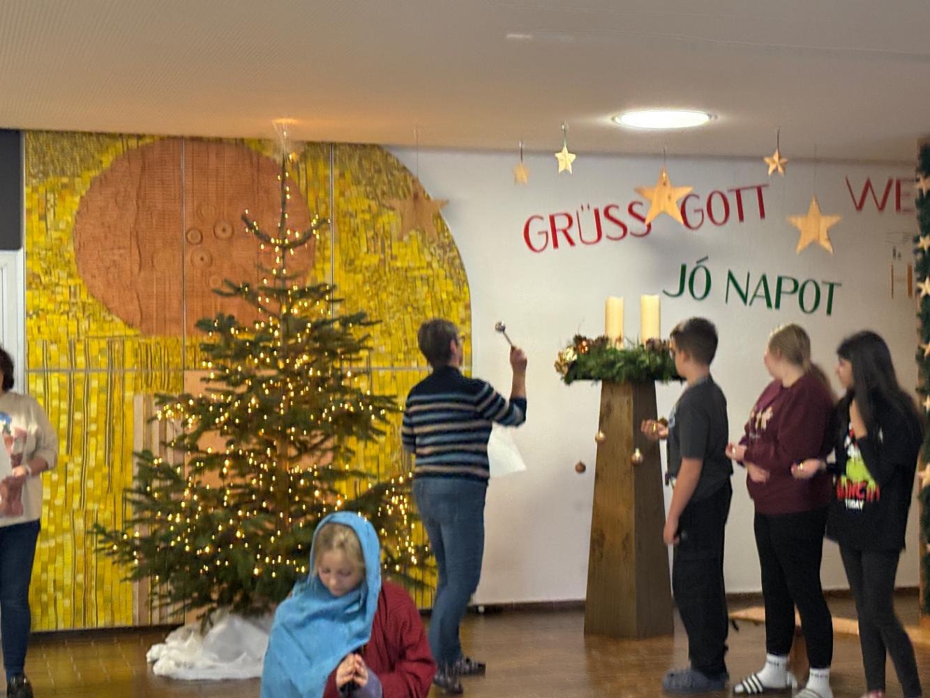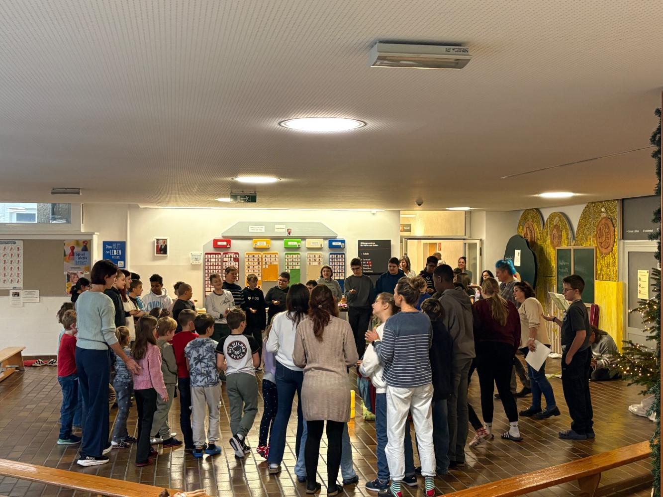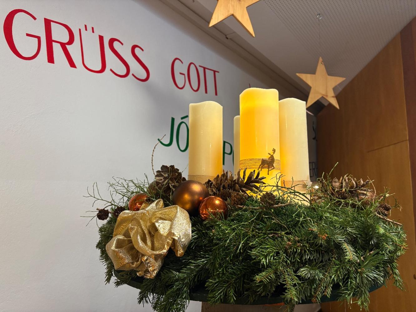 Mit einem stimmungsvollen Beisammensein, das unsere Reli-Lehrerinnen geplant hatten, feierten wir den Beginn der Adventzeit. Jede Klasse bekam einen Adventteller mit vier Kerzen, der uns ebenso wie die kommenden Adventimpulse in vorweihnachtliche Stimmung bringen soll. Am großen Adventkranz wurde die erste Kerze entzündet. Danke an alle, die die Adventkranzweihe vorbereitet und auch an all jene, die heute mitgefeiert haben!