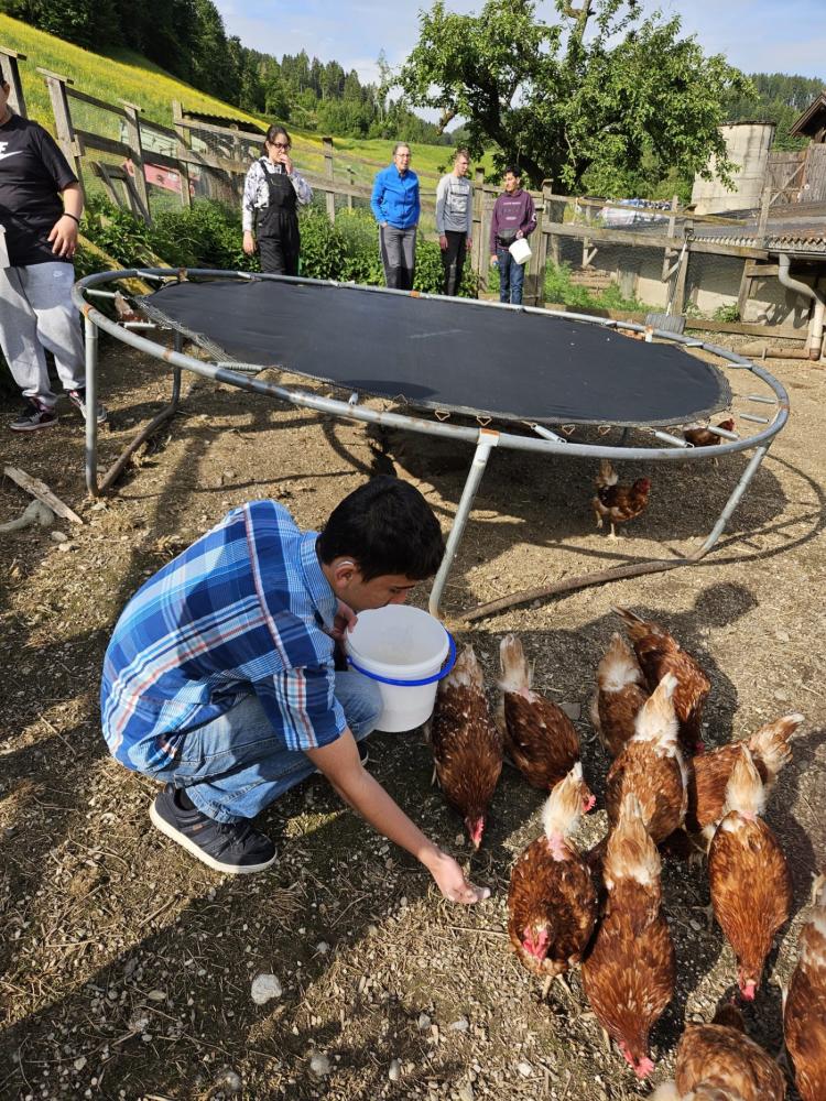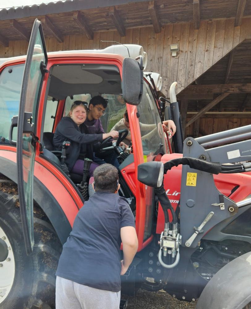 Dann durften die Kinder die Kühe und das Pferd füttern. Elias und David fütterten ein kleines Lamm mit Ziegenmilch aus der Flasche. Alle Kinder durften auch in einen Traktor sitzen. Später trafen sich alle wieder am Startpunkt und machten eine Pause. Danach fütterten sie die Hühner. Sie gingen in den Hühnerstall und sammelten Eier. Dann wogen sie die Eier und stempelten sie. Auch die Schweine wurden angeschaut und mit Gras gefüttert. Am Ende machten alle einen Melkwettbewerb.