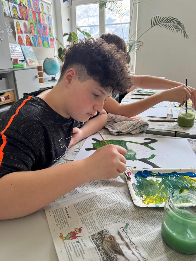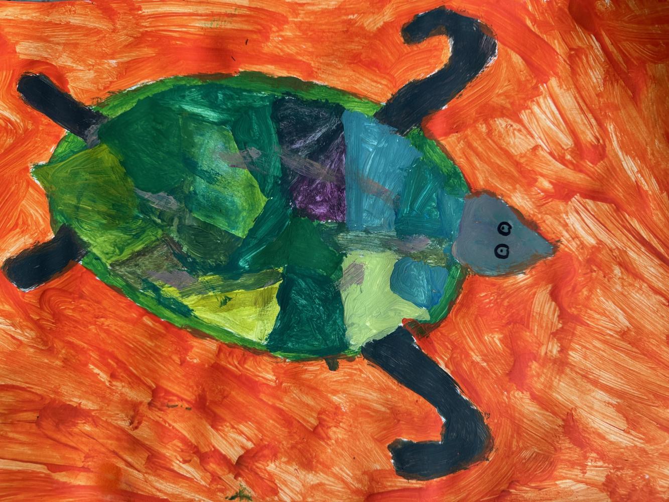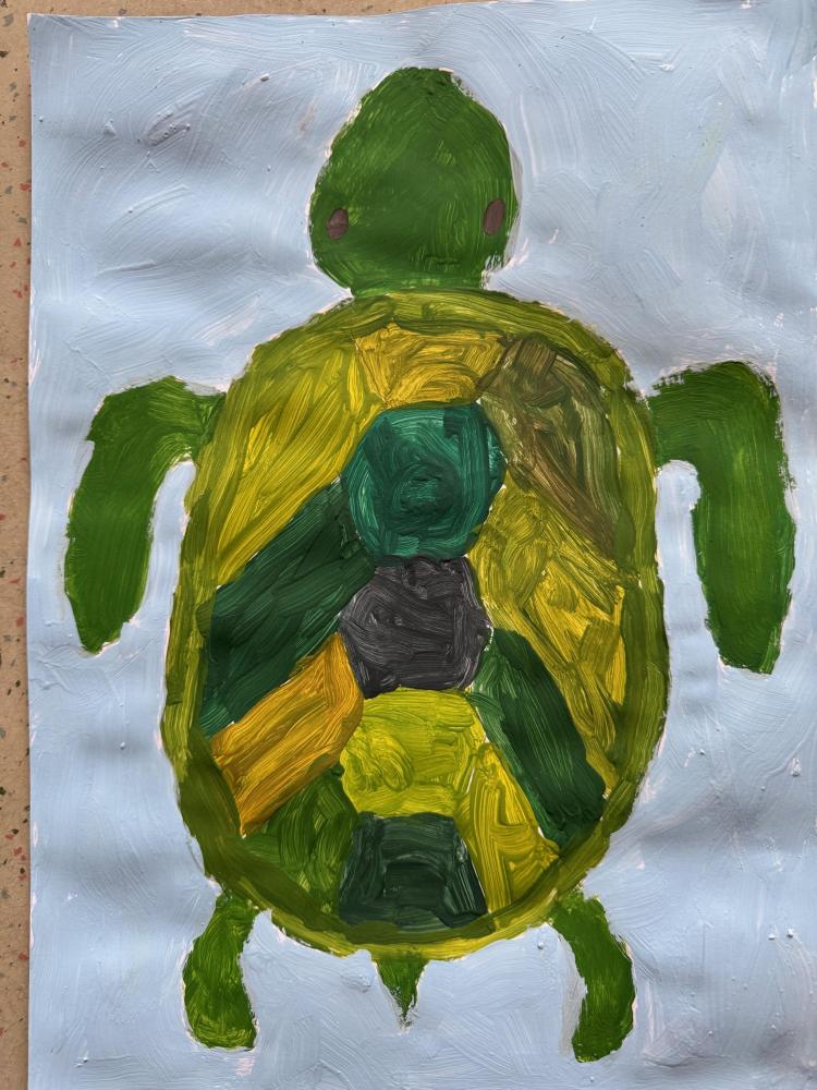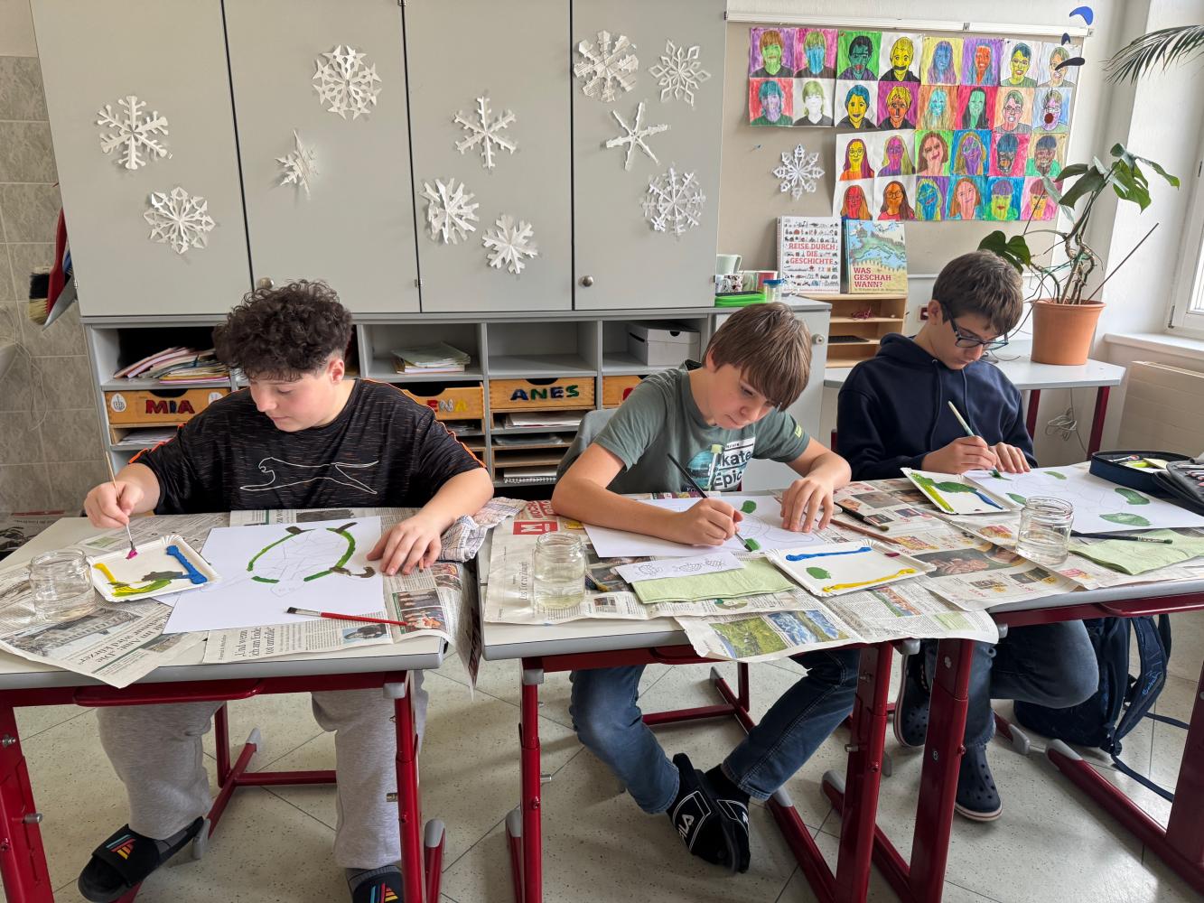 "Am Donnerstag, den 30.01.2025, kam Nina Schmid, eine Künstlerin vom Tiroler Kulturservice, an unsere Schule. Die 2. und 3.MS waren dabei und es fand im Klassenraum der 2.MS statt. Um 13:30 Uhr begann der Kunst-Workshop. Als erstes stellte sich die Künstlerin vor und erzählte uns, welche verschiedenen Farbtöne es gibt. Sie gab den Klassen einen Auftrag: Die Schülerinnen und Schüler mussten als erstes eine Schildkröte malen und dann das Tier mit verschiedenen selbst gemischten Grüntönen ausmalen, danach den Hintergrund bemalen und das Bild trocknen lassen. Um 15:10 Uhr war es vorbei. Am Workshop hat mir am besten das Farbenmischen gefallen." (Niklas)