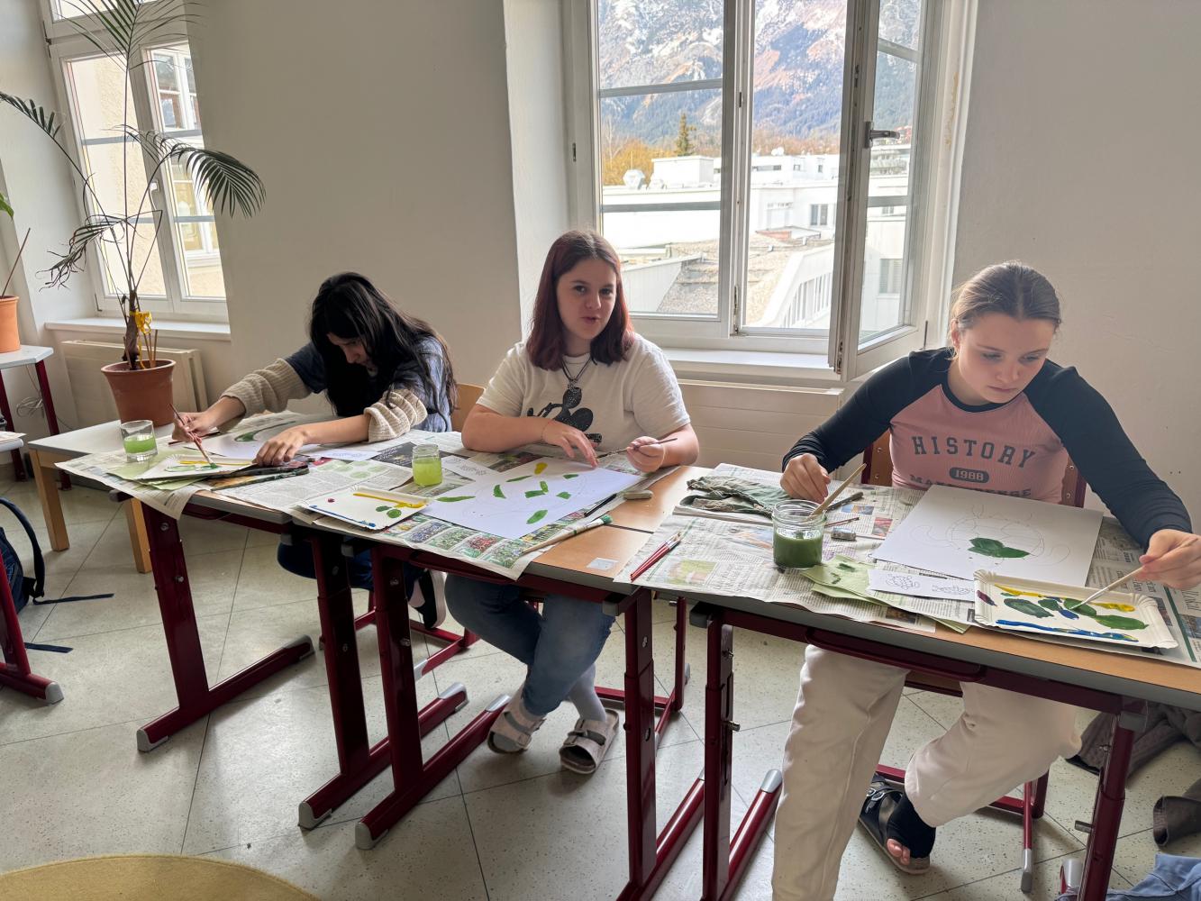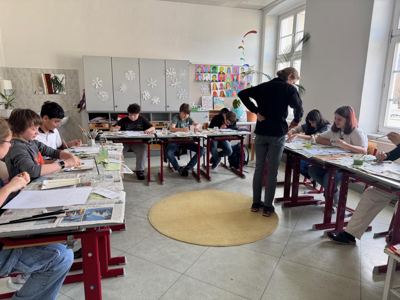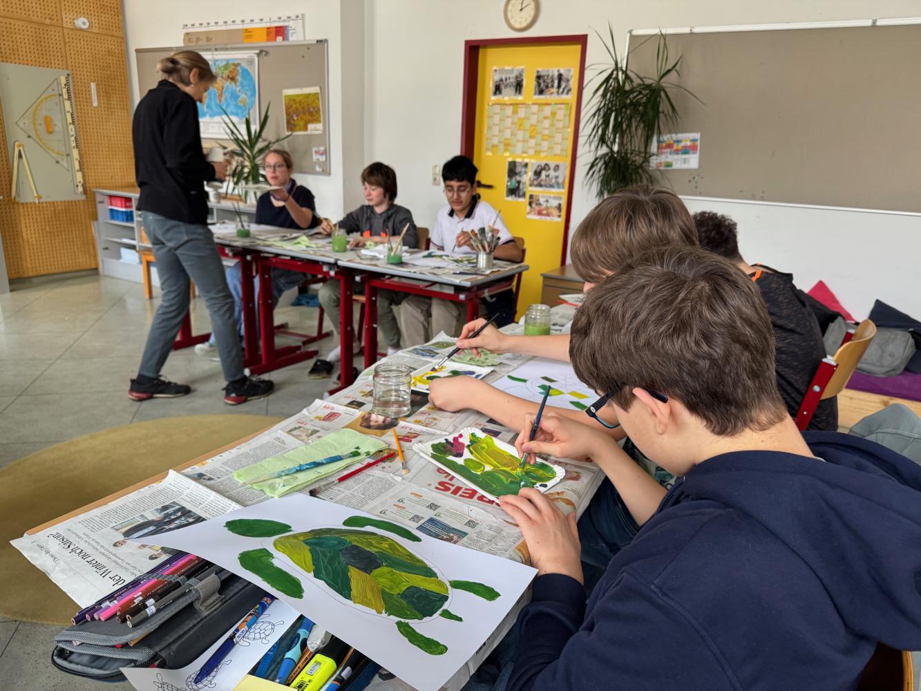 "Am Donnerstag, den 30.01.2025, kam Nina Schmid, eine Künstlerin vom Tiroler Kulturservice, an unsere Schule. Die 2. und 3.MS waren dabei und es fand im Klassenraum der 2.MS statt. Um 13:30 Uhr begann der Kunst-Workshop. Als erstes stellte sich die Künstlerin vor und erzählte uns, welche verschiedenen Farbtöne es gibt. Sie gab den Klassen einen Auftrag: Die Schülerinnen und Schüler mussten als erstes eine Schildkröte malen und dann das Tier mit verschiedenen selbst gemischten Grüntönen ausmalen, danach den Hintergrund bemalen und das Bild trocknen lassen. Um 15:10 Uhr war es vorbei. Am Workshop hat mir am besten das Farbenmischen gefallen." (Niklas)