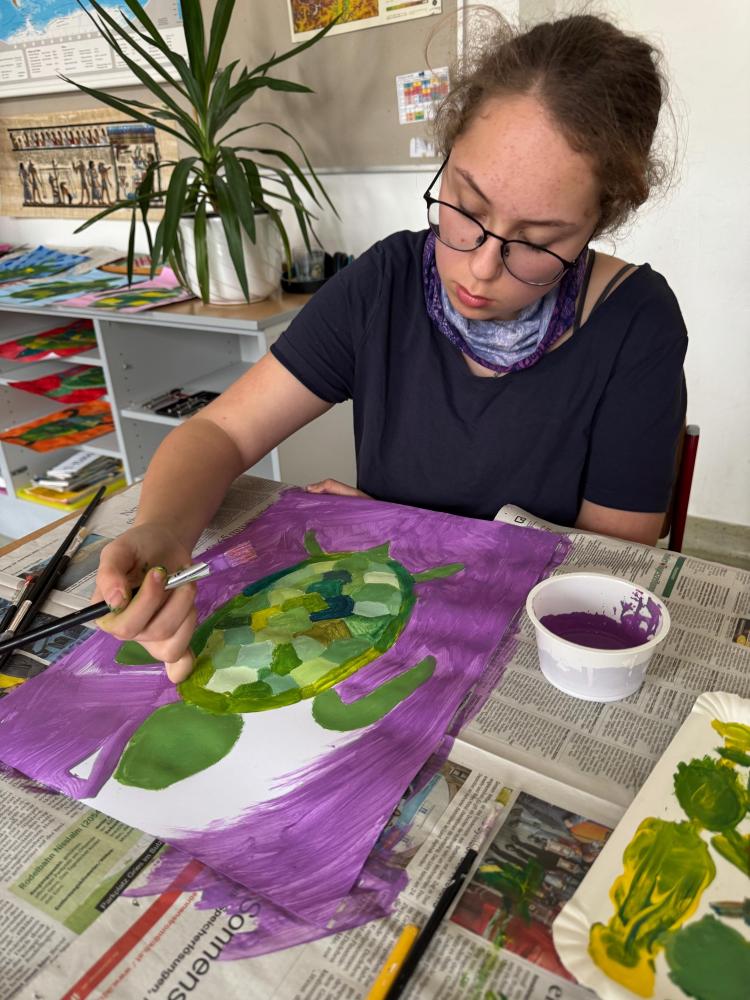 "Am 30.01.2025 von 13:30 bis 15:10 Uhr war die Künstlerin Nina Schmid bei der 2.und 3.MS im Bildungszentrum für Hören und Sehen (Klassenraum 2.MS). Sie hielt einen Kunst-Workshop: Malen mit Acryl, das sind dickflüssige Farben. Wir malten Schildkröten. Es war ein Angebot des Tiroler Kulturservice. Am besten hat mir das Farbenmischen auf den Papptellern gefallen." (Leon)