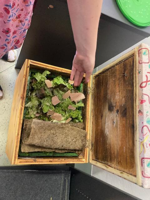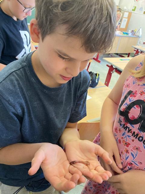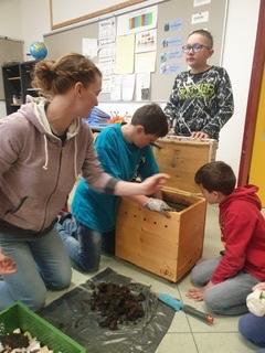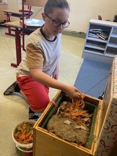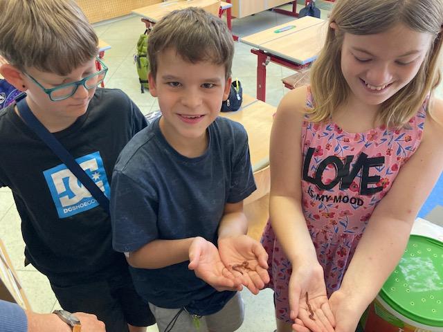 In der 4.VSa ist dieses Schuljahr die Wurmkiste im Klassenzimmer auf Besuch. Täglich füttern die Schüler die Würmer mit Bioabfall, wie zum Beispiel ein Apfelputzen, Salatreste oder Karottenschalen. Wenn viel Feuchtigkeit entsteht, sammelt sich diese in einer Schublade und kann so regelmäßig als Dünger geerntet werden.